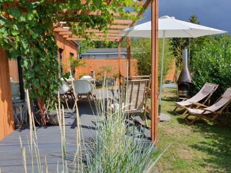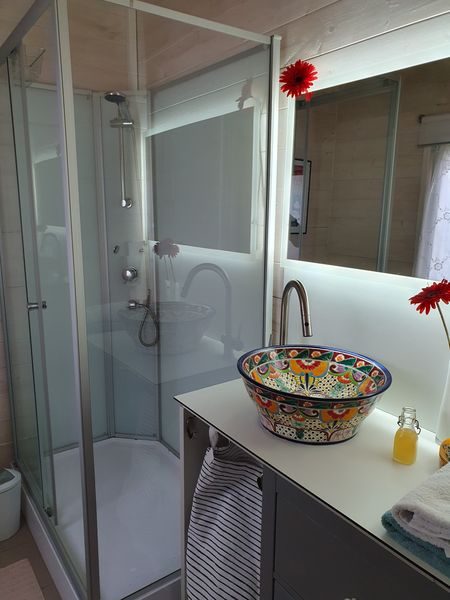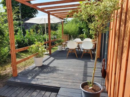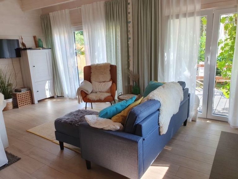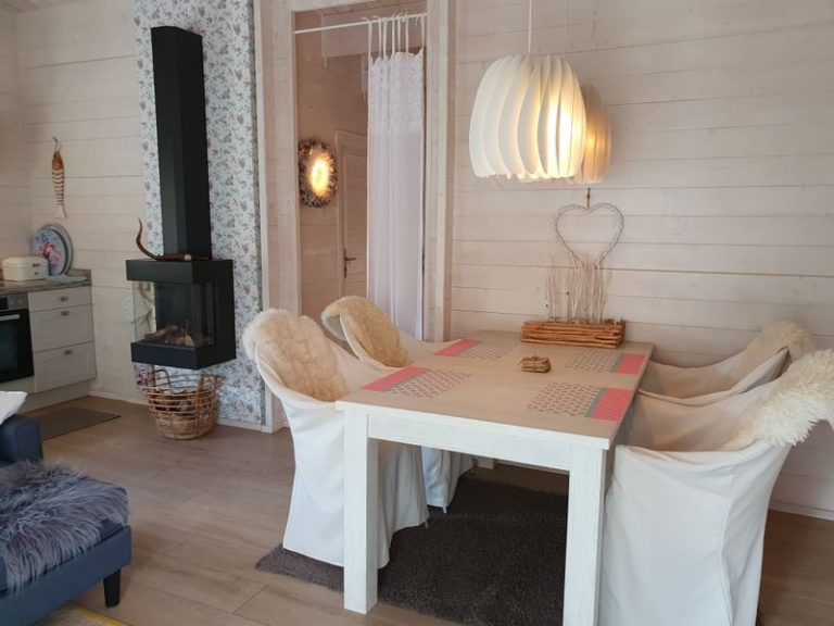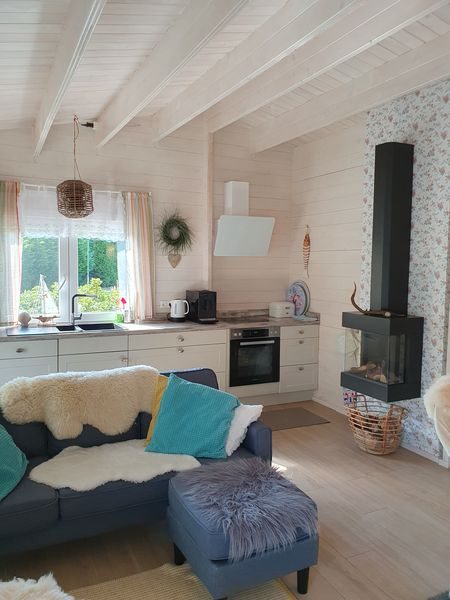 Das charmant eingerichtete Holzhaus verfügt über eine kompl. eingerichtete Einbauküche, 2 Schlafzimmer mit 2 Einzelbetten und einem Doppelbett, Duschbad mit WC und Duschkabine 80x120 cm, Waschbecken mit Kindertritt und Fön, Essbereich auf Wunsch mit Kinderstuhl, gemütliche Sitzgruppe mit TV , WLAN und gemütlichem Gaskamin, kleiner Garten mit Liegestühlen und Gartengrill, Ladestation für E-Bikes und überdachte Raucherecke.